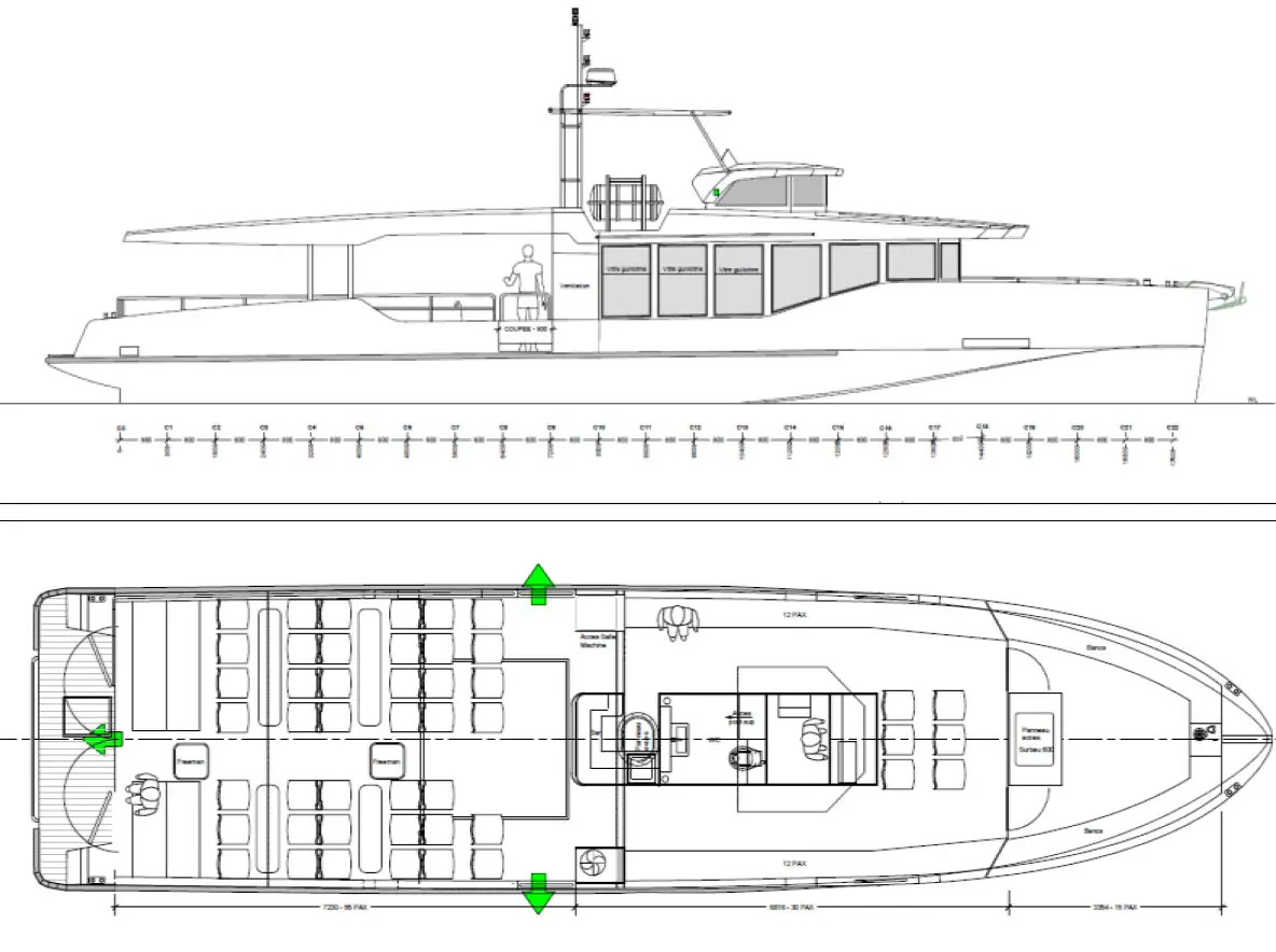 Conçu par l’architecte naval JACQUES ROUGERIE, ce navire de 8 mètres peut embarquer 10 passagers en toute sécurité pour une plongée sous marine au sec.