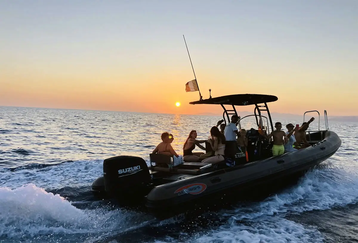 Larguez les amarres en dehors des horaires d’affluence à bord de nos semi-rigides, au coucher du soleil, cap vers les merveilles de l’archipel des Embiez, débarquez sur l’île du grand Rouveau et découvrez les Calanques du Var. Profitez de ce moment hors du temps pour partager un apéritif composé de produits locaux et piquez une tête au coucher du soleil.
